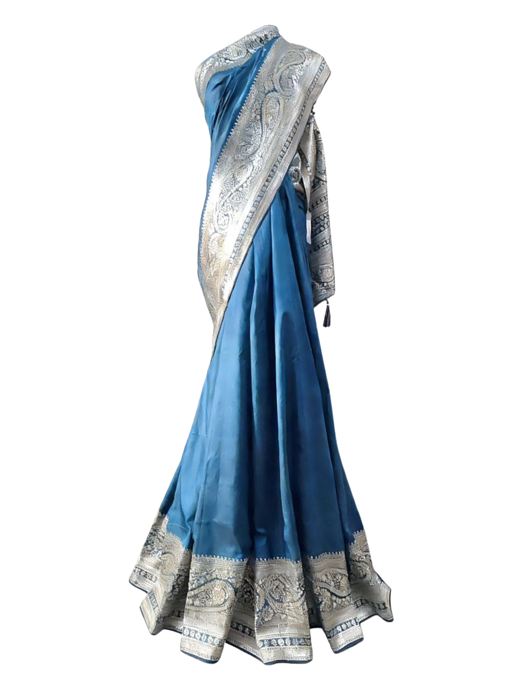 Command attention with the majestic allure of this Celestial Cerulean Saree. A masterpiece of traditional Indian weaving, this saree is crafted from premium Art , offering a rich, liquid-like drape and a magnificent natural sheen. The vibrant teal-blue base provides a regal canvas for high-contrast Silver Zari work, making it an quintessential choice for grand weddings, evening receptions, and high-profile festive celebrations.
